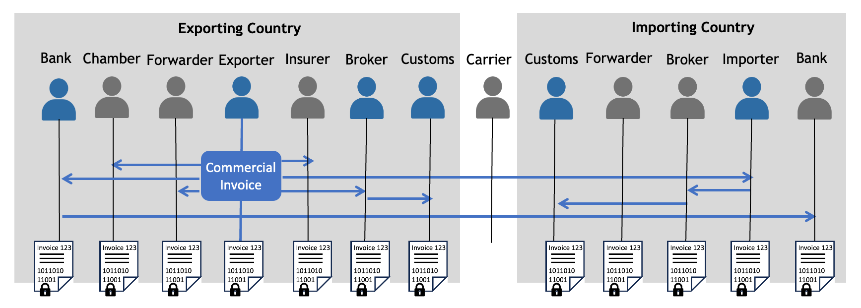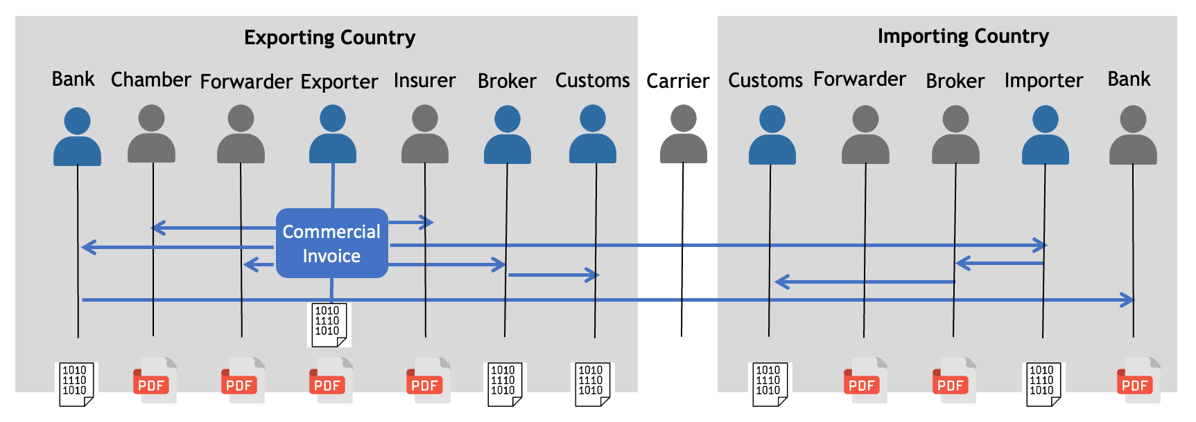 The fundamental problem is that a trade document does not flow between just two parties. A commercial invoice, for example, is used by the exporter, importer, banks, insurers, customs authorities in both countries, chambers of commerce, brokers, and freight forwarders.