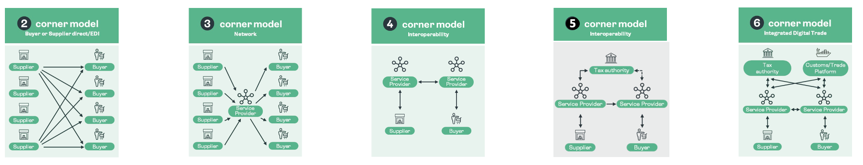 - 4-corner (interoperability) — hubs connect to each other (like PEPPOL), but what about other parties like tax authorities?