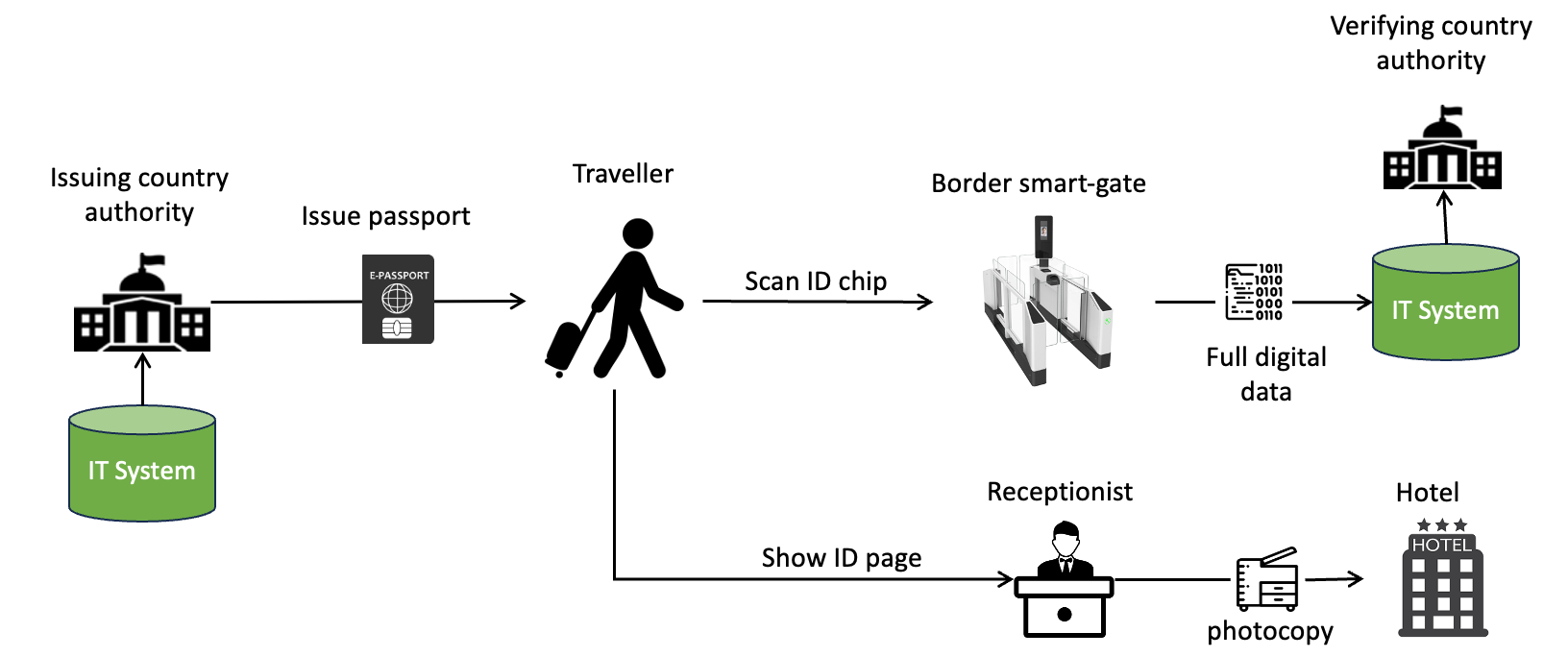 An e-passport is issued by one country’s authority and verified by another country’s border system — with no direct connection between the two IT systems. The traveller carries it. The border smart-gate scans the chip and gets full digital data. The hotel receptionist just looks at the ID page and takes a photocopy. Each country moved to e-passports in their own time, with no dependency on others.