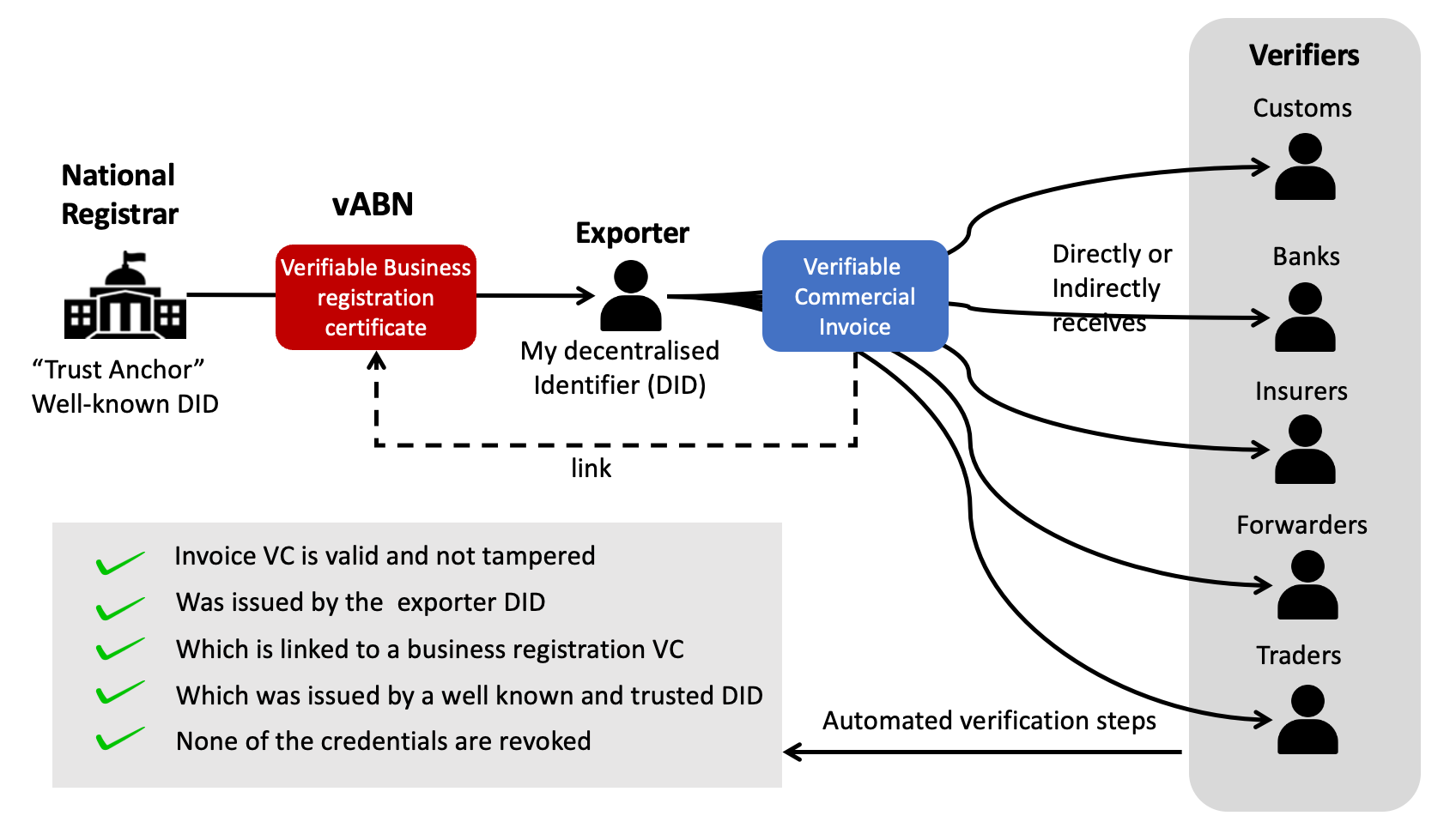 Trust anchors are institutions society already relies on — national business registers, customs authorities, IP offices — now issuing their registrations as verifiable credentials (vBN, vAEO, vTrademark, etc.). When a verifier receives a trade document, the automated verification steps are: