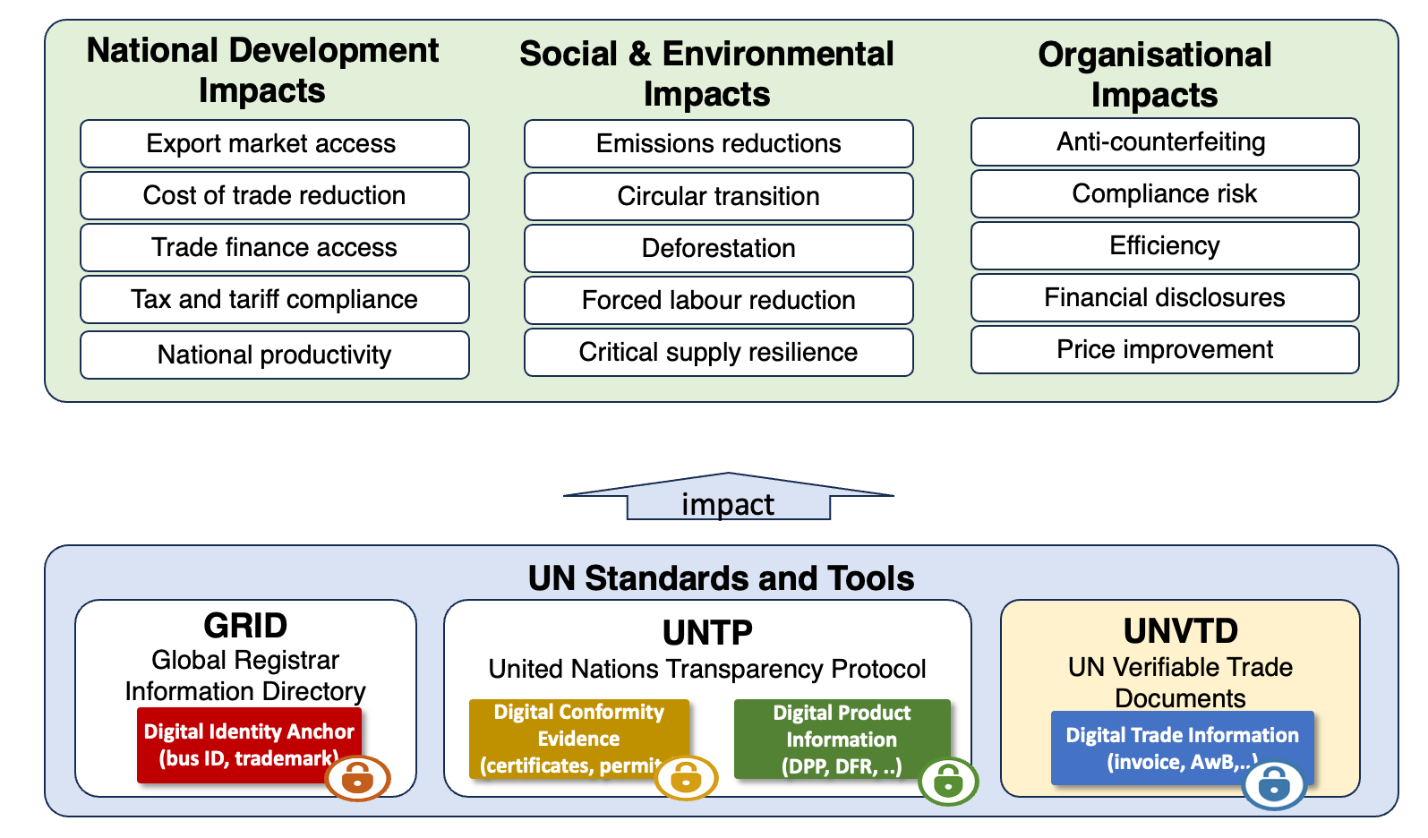National Development Impacts — export market access, cost of trade reduction, trade finance access, tax and tariff compliance, and national productivity.