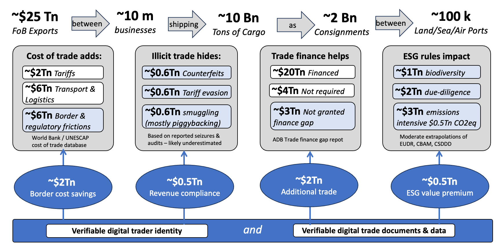 International trade is enormous — approximately $25 trillion in annual FoB exports, moving between 10 million businesses, shipping 10 billion tons of cargo as 2 billion consignments between 100,000 land, sea, and air ports. The costs and frictions embedded in this system are equally enormous.